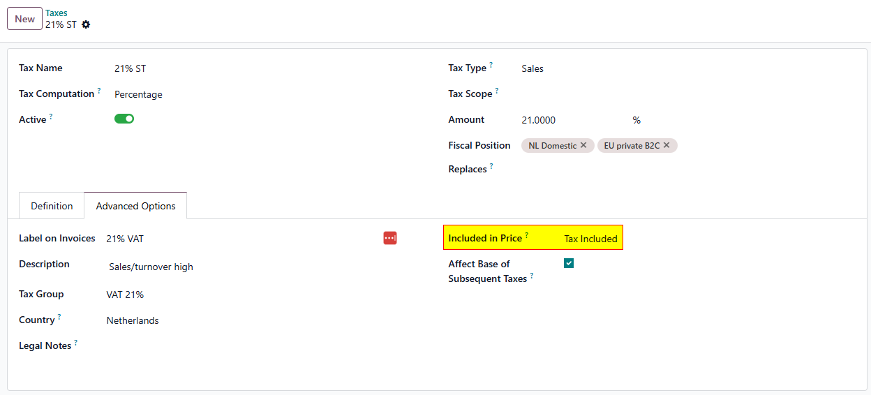 - Open the tax you want to configure (e.g., your 21% VAT rate)